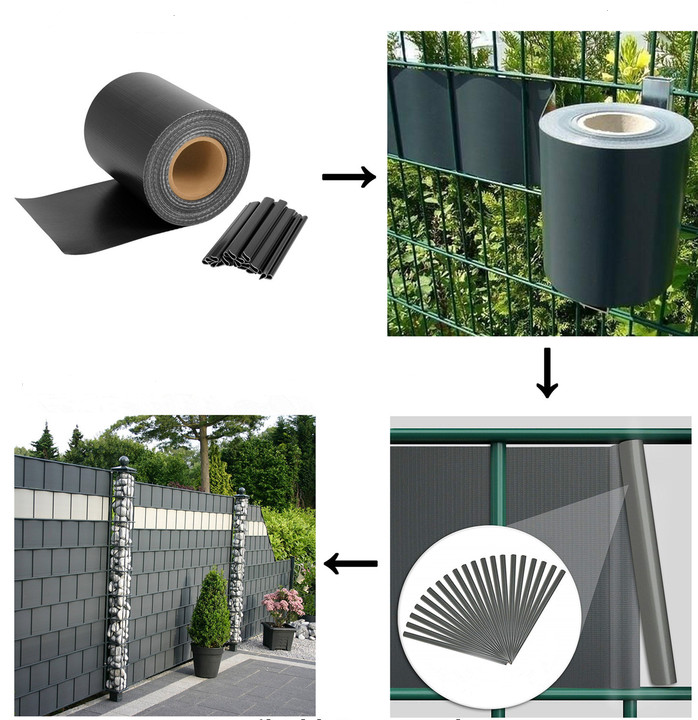 Vyrobené z vysoko kvalitného PVC s hmotnosťou 450 g/㎡. Odolné proti vode, UV žiareniu a nečistotám. Okrem toho pomáha minimalizovať vonkajší hluk. Perfektne sa hodí na domáce železné ploty, priemyselné ploty a balkónové zábrany s rozostupom mriežky 20 cm!