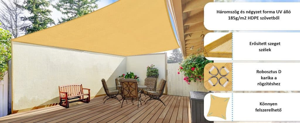 A csomag tartalmazza kész napvitorlát és a rögzítő köteleket.